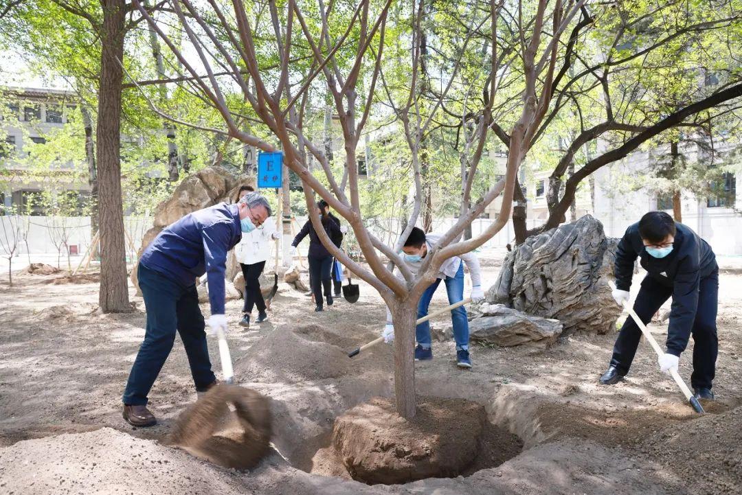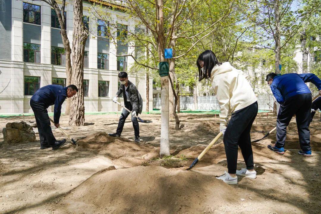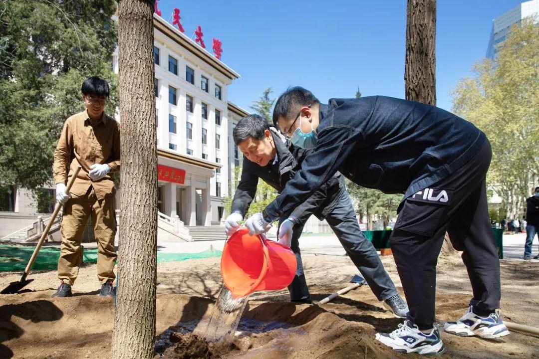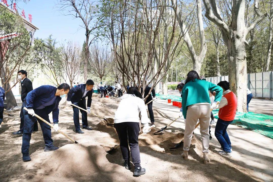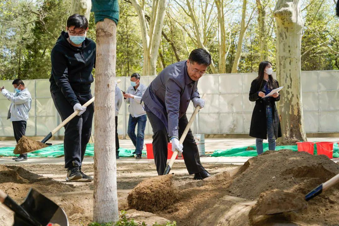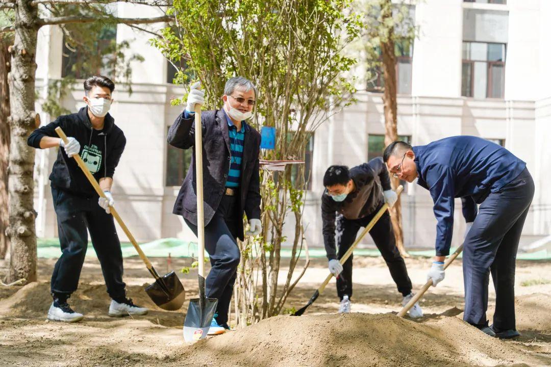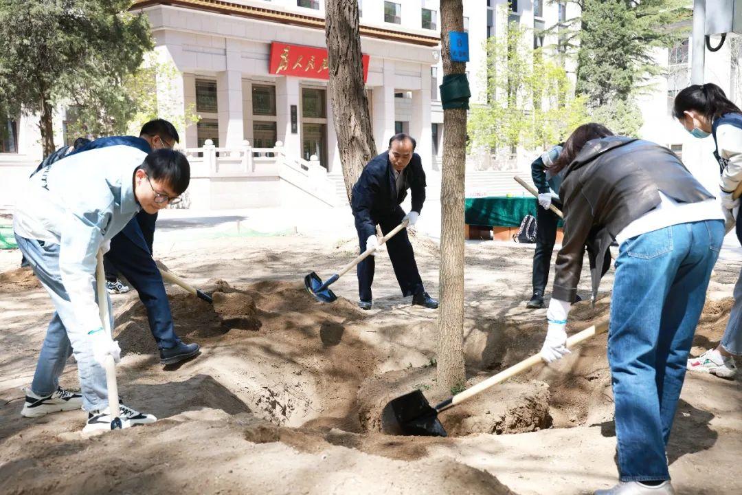 春风吹开万物苏,趁时植树盼栋梁。4月15日上午,校长徐惠彬,党委副书记、纪委书记何新洲,副校长刘树春、黄海军、王云鹏,党委副书记赵罡、程波等一行,来到学院路校区主楼东侧的北京一号、北京二号景观绿地进行义务植树活动。