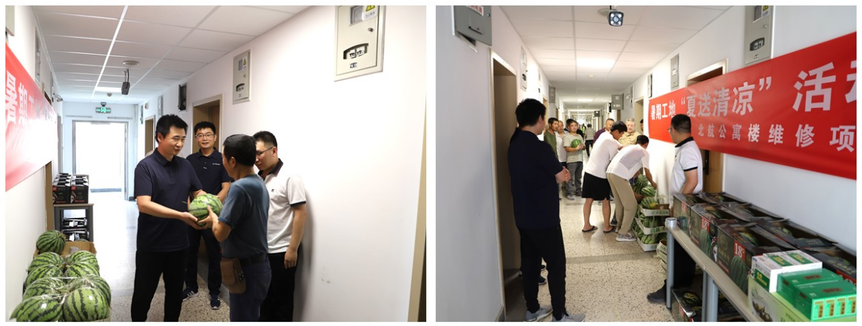 6月20日中午,总务部副部长田云枭带队对沙河校区公寓改造项目施工人员发放慰问品,并予以亲切慰问。